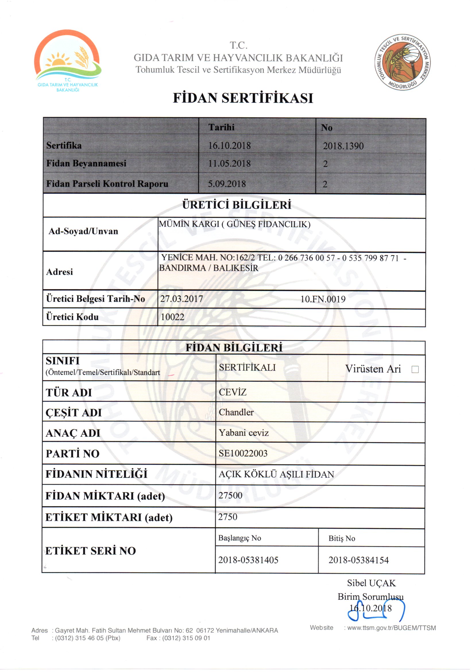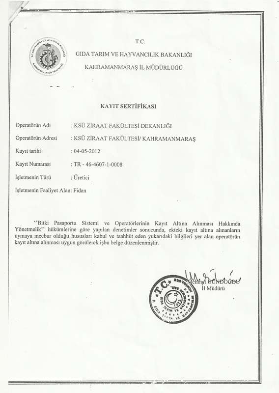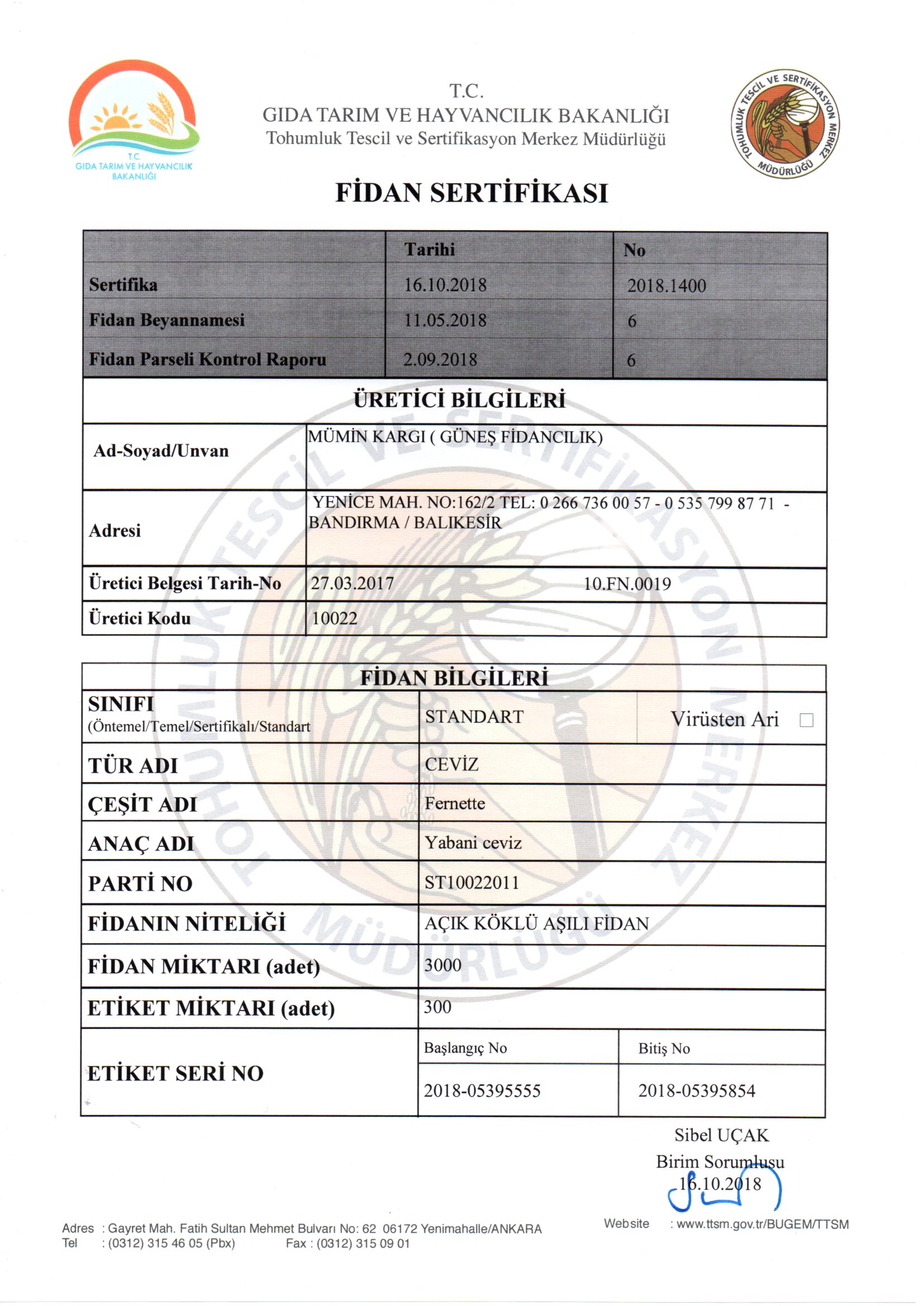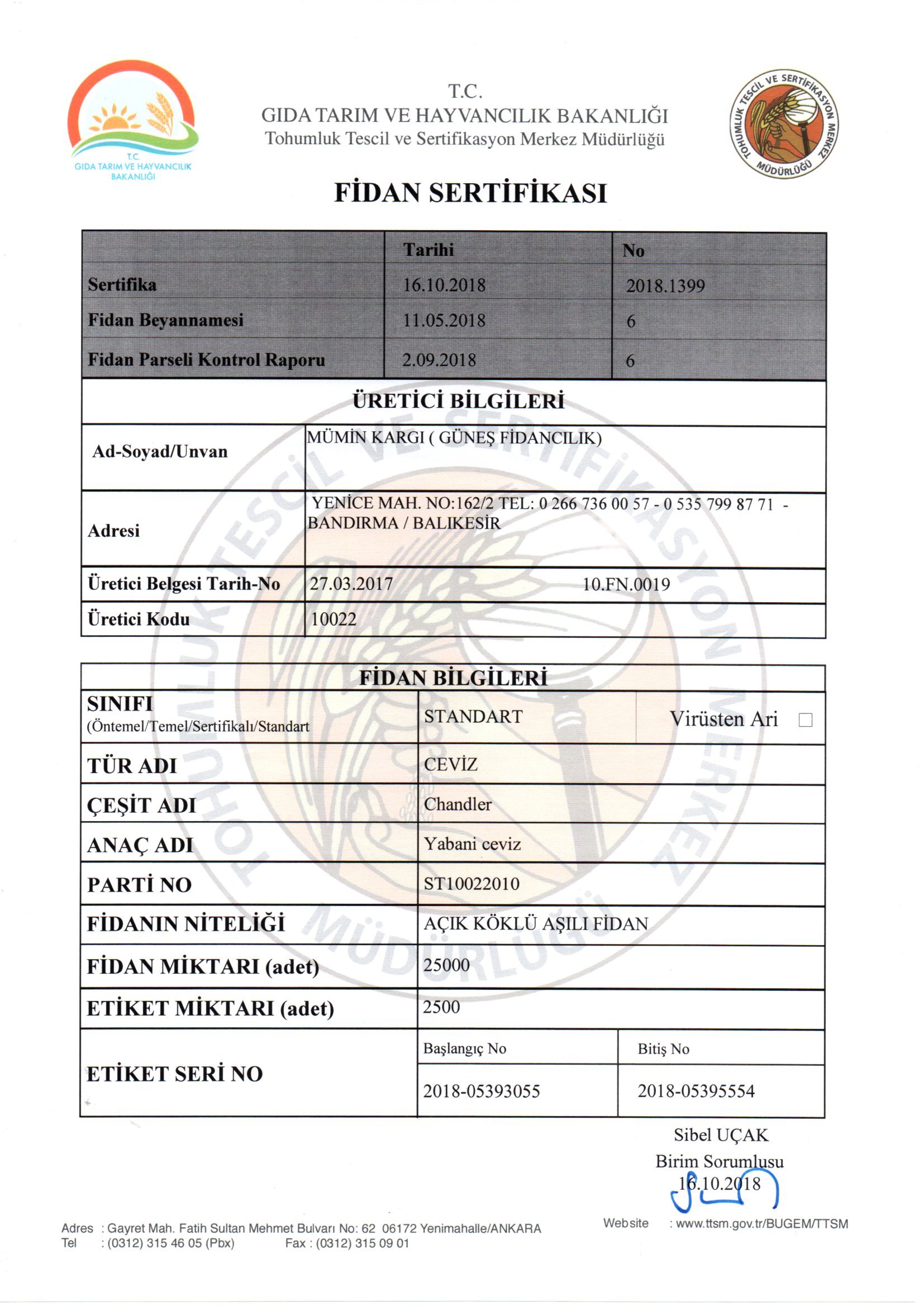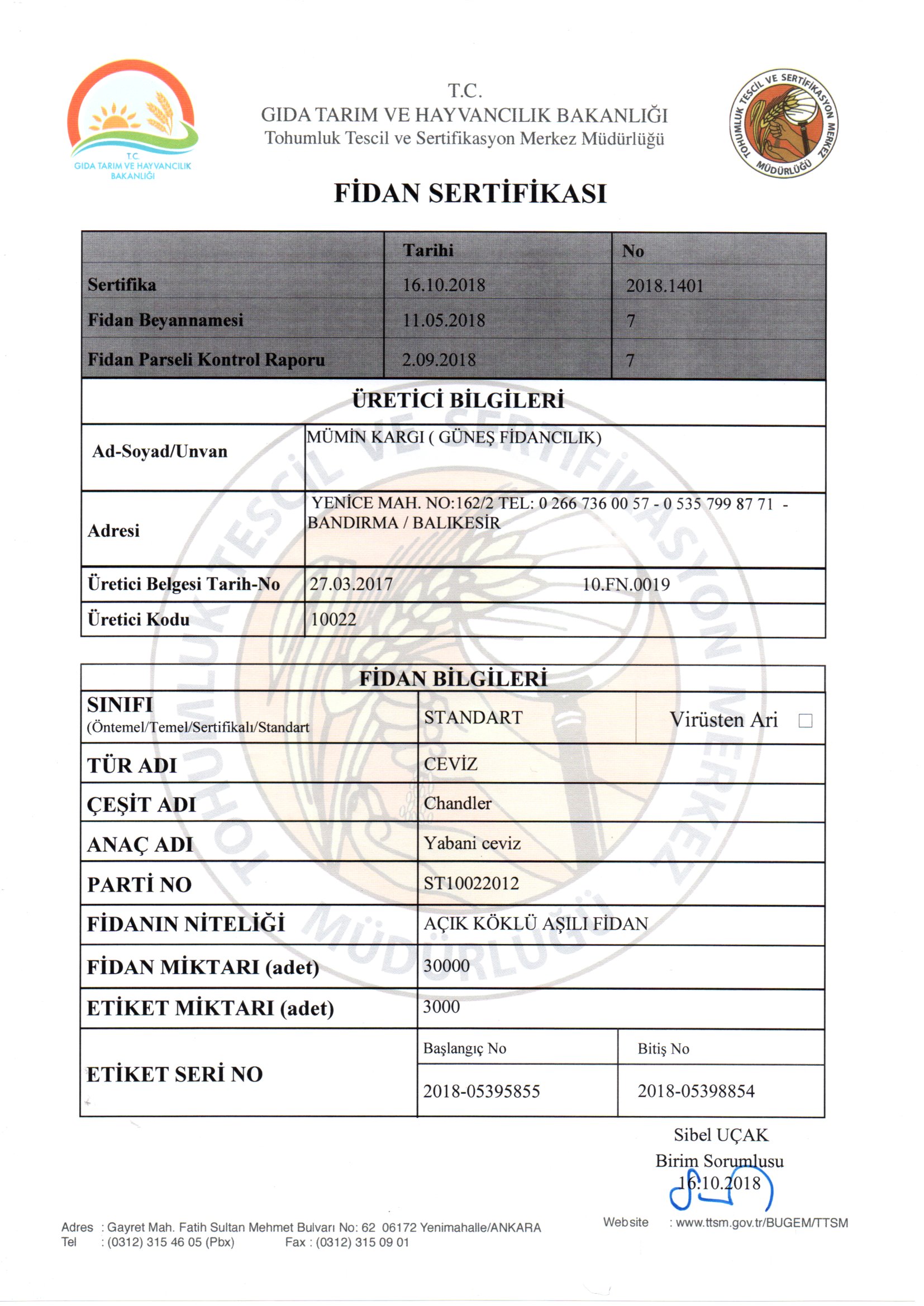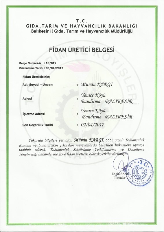 Firmamız T.C. Tarım ve Orman Bakanlığı kontrolünde üniversitelerden alınan aşı kalemleri ve damızlıkları ile üretim yapmaktadır. Sertifikalarımızı bu sayfamızdan inceleyebilirsiniz.